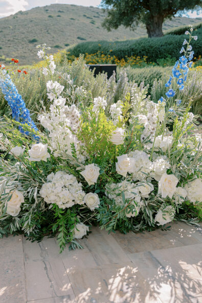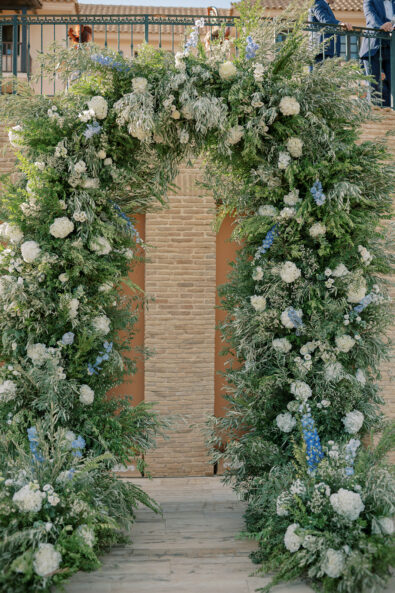 To dress up such a magnificent venue, one needs unique and impressive details as well. After selecting white and light blue as the main color scheme, the rest did not have a choice but to follow. White and light blue flowers, with a lot of greenery to compliment them, were used for the majority of the arrangements. They were also the main components of the most gigantic and grandiose ceremony arch we ever had the pleasure of designing. And to add even more to that, smaller arrangements in the same theme and style were carefully positioned on the edges of the aisle, as if flowers had grown out on both sides, similarly to how their love for each other would continue to grow throughout their lives!